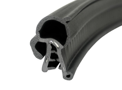This rubber edge trim fits onto a 2mm to 3mm thick panel and has a 12.3mm sponge sealing bulb. It is manufactured with a self-gripping metal spine that allows the section to hold itself onto the panel edge without the need for adhesive or mechanical fixings. Unlike standard rubber edge trims, this top seal can be used within the caravan and motorhome industry to seal habitation doors, lockers and some other enclosures. This sponge rubber sealing bulb is located on the top of the edge trim and compresses when squashed by a closing door or lid.